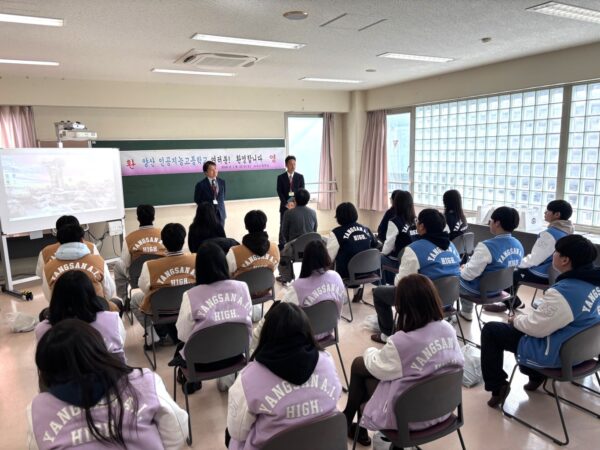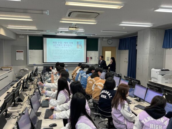 令和8年1月23日(金)、韓国の梁山人工知能学校の生徒18名をお迎えしました。人工知能学校は、韓国がAIに特化した学校として政府肝いりで作られた学校です。本校も、ITフロンティアコースがあるので、そのご縁で来校されました。本校の多くのコース、例えば福祉コースやパティシエコースなどを見学していただき、その後ITフロンティアコースで講義を受講してもらいました。最後に、食堂で歓迎会を行ないました。将来のAI社会の中核を担うために、両校の隆盛を願い、交流を続けたいと約束しました。